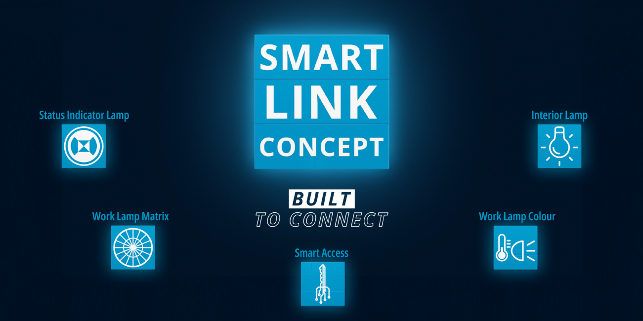 The innovative Smart Link Concept connects all the lighting and electronic components of a construction machine cabin, from work lamps to interior lighting. Thanks to digital networking, the work lamps, sensors, cameras and other electronic components communicate with each other via the data bus. This simplifies the system architecture and enables the integration of new technologies and functions. Software updates, as is already common in the automotive sector, can now also be used to bring construction machinery up to date with the latest technology.